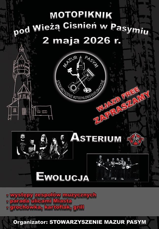 Motopiknik pod Wieżą Ciśnień w Pasyminiu to wspaniałe wydarzenie, które łączy miłośników muzyki i motoryzacji. Impreza oferuje wyjątkową atmosferę z występami zespołów oraz atrakcjami dla uczestników.Program wydarzeniaWystępy zespołów muzycznych: Asterium i Ewolucja.Parada ulicami miasta.Rozmaite pr...