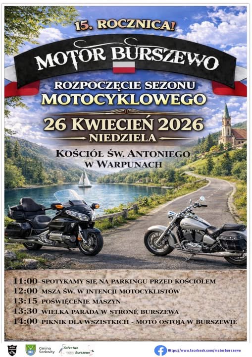 Zapraszamy na wyjątkowe wydarzenie, jakim jest 15. Rocznica Rozpoczęcia Sezonu Motocyklowego organizowana przez Motor Burszewo. To doskonała okazja, aby spotkać się z pasjonatami motocykli w malowniczej okolicy.Program wydarzenia11:00 - Spotykamy się na parkingu przed kościołem.12:00 - Msza Św. w in...