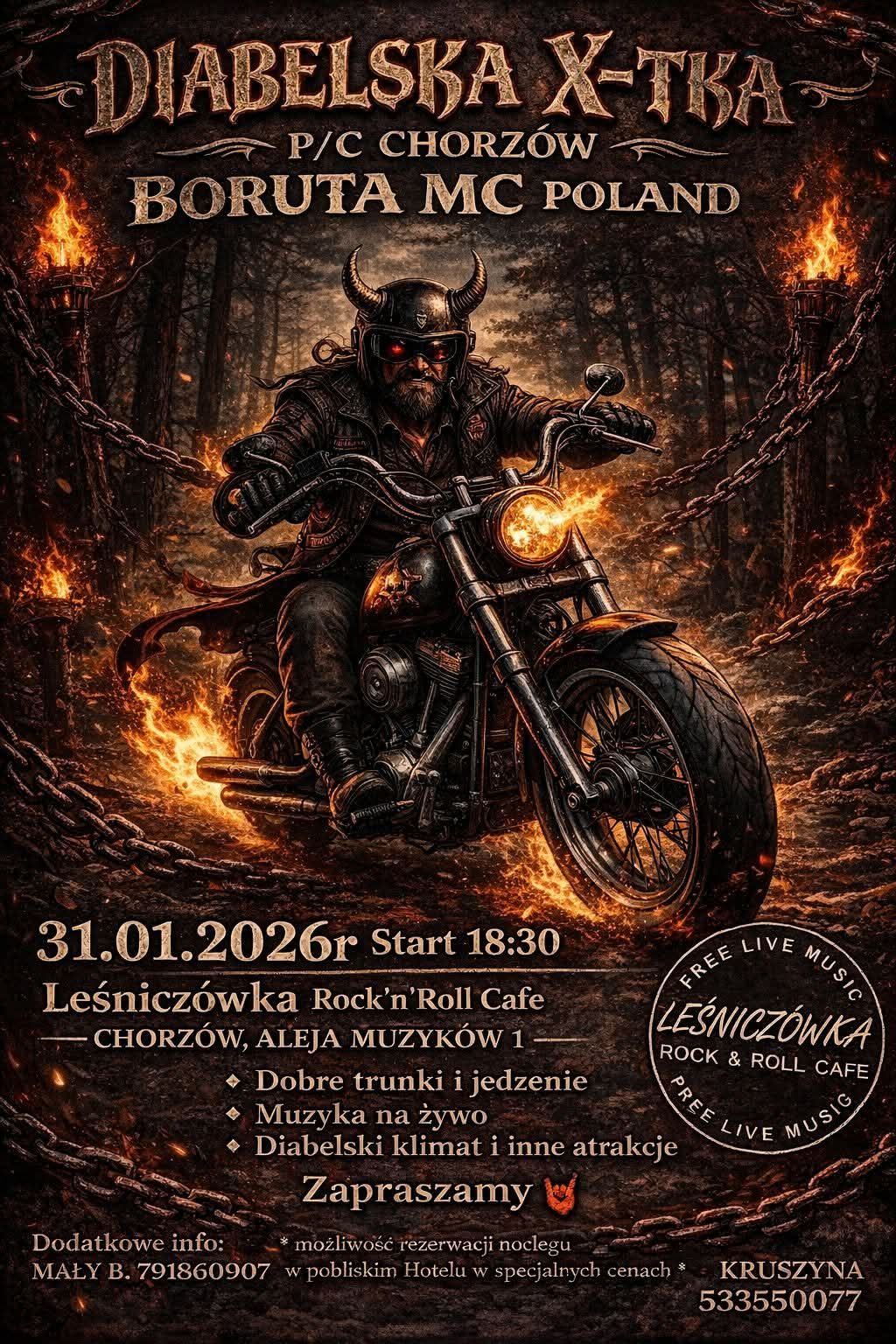 Klub Boruta MC Poland (P/C Chorzów) zaprasza na wyjątkowe, klimatyczne spotkanie motocyklowe pod nazwą Diabelska X-tka. Wydarzenie odbędzie się w rockowym klimacie, z muzyką na żywo, dobrym jedzeniem i charakterystyczną, mroczną oprawą.